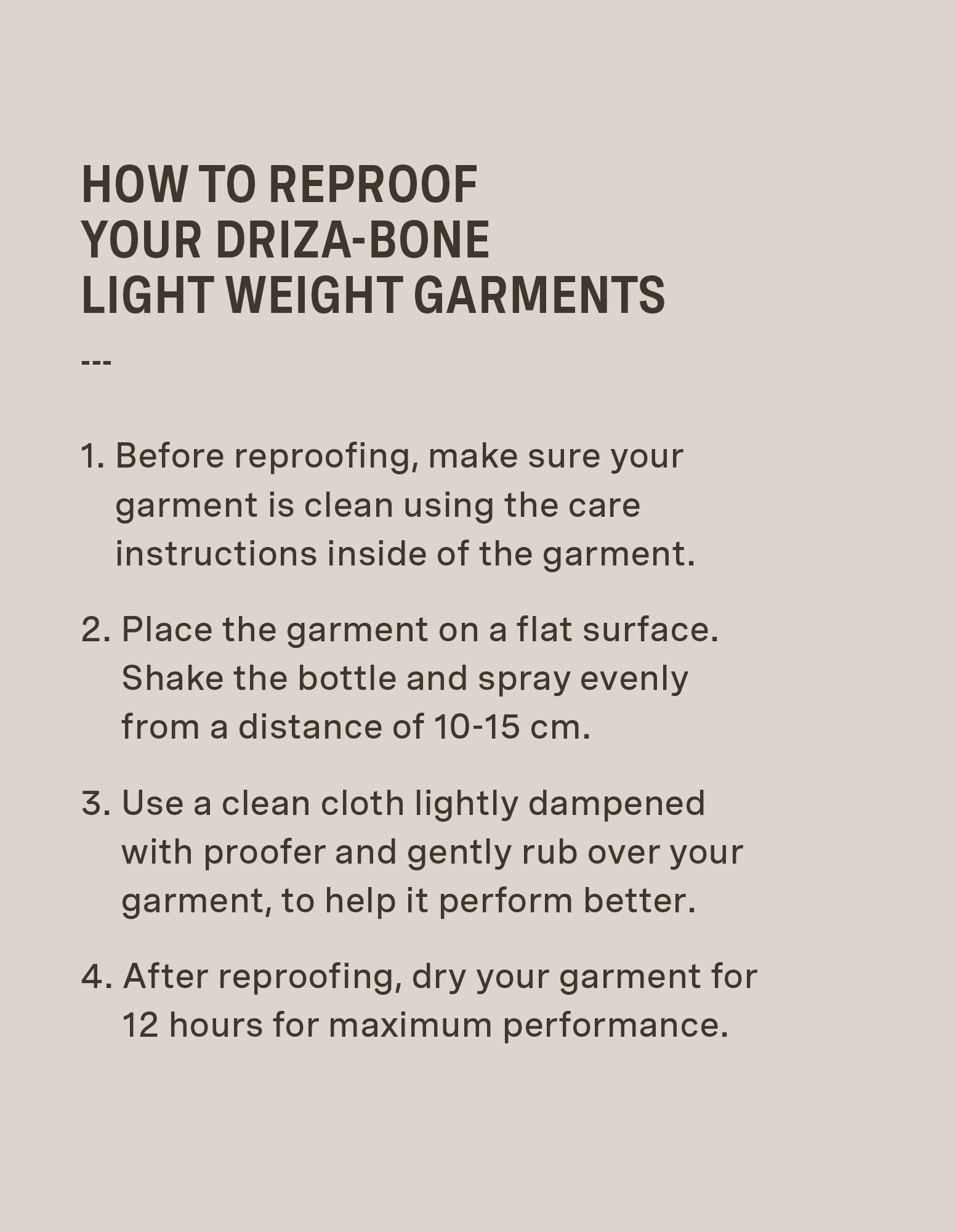 Keep your Driza-Bone jacket performing at its best with our Reproofing Spray. Made for light weight garments, this easy-to-use spray restores your jacket’s ability to shed rain and protects it from the elements. Fluorocarbon-free and enough to treat up to two garments.