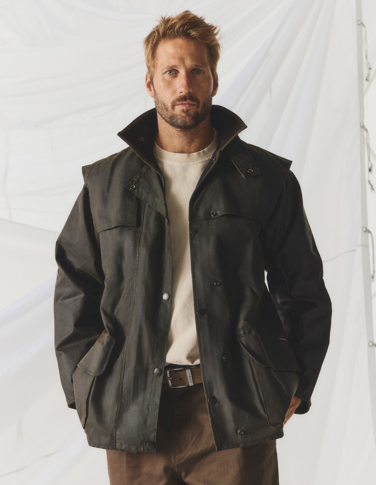 Shorter than our traditional working styles, the Drover Jacket retains the same sought after functionality. Crafted from our premium wind and water resistant heavy weight oilskin, this style features classic cape shoulder detailing, lower double entry pockets and 100% cotton lining.