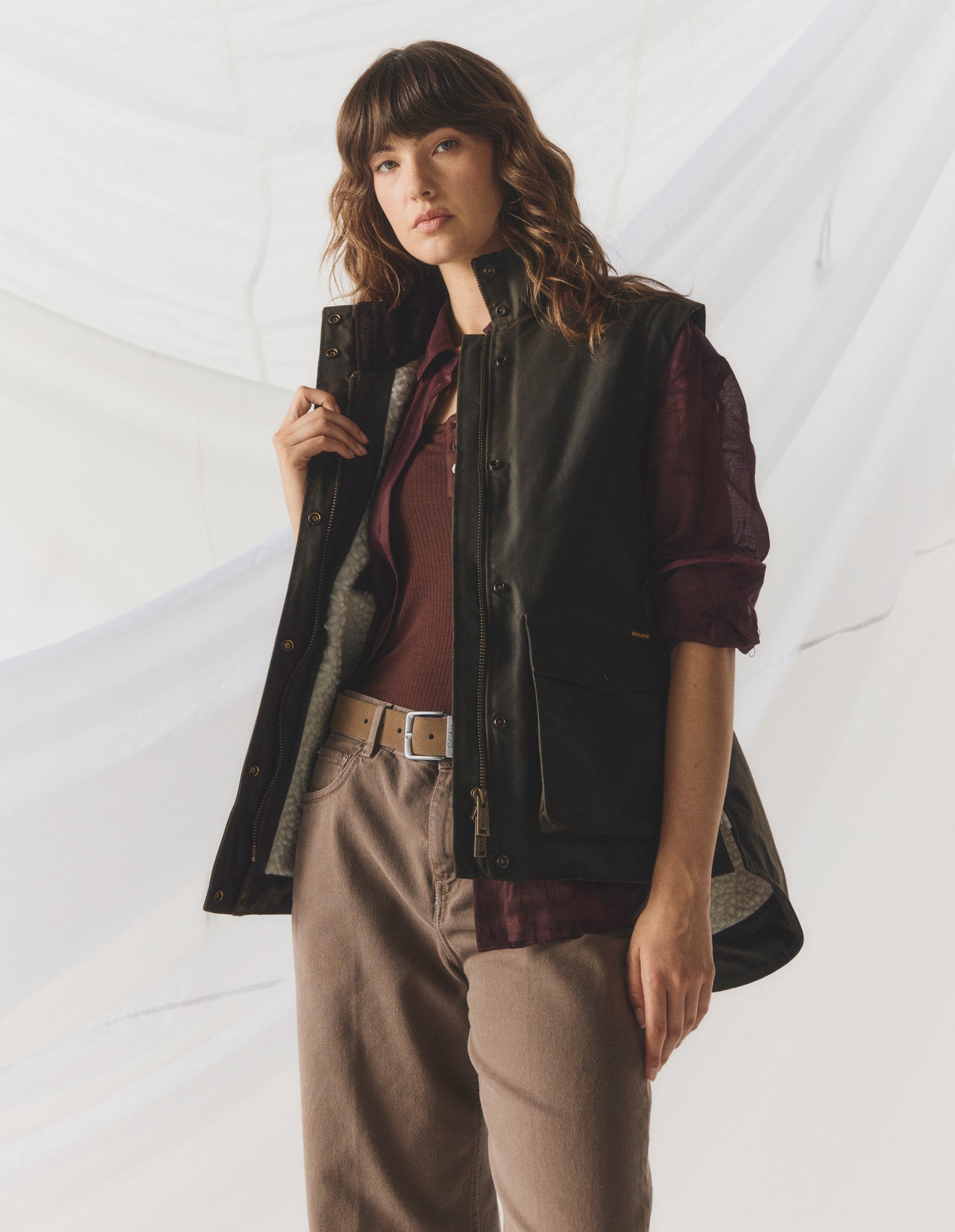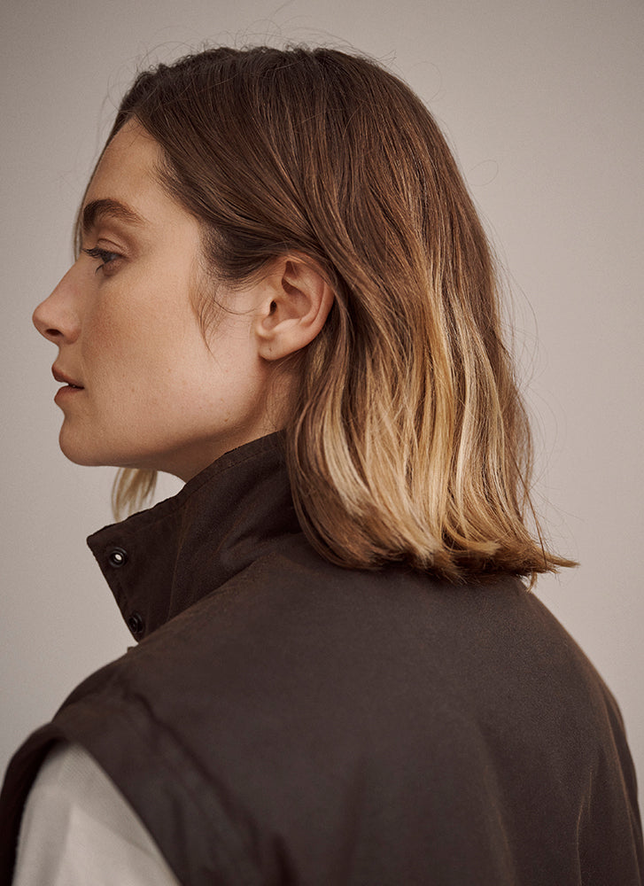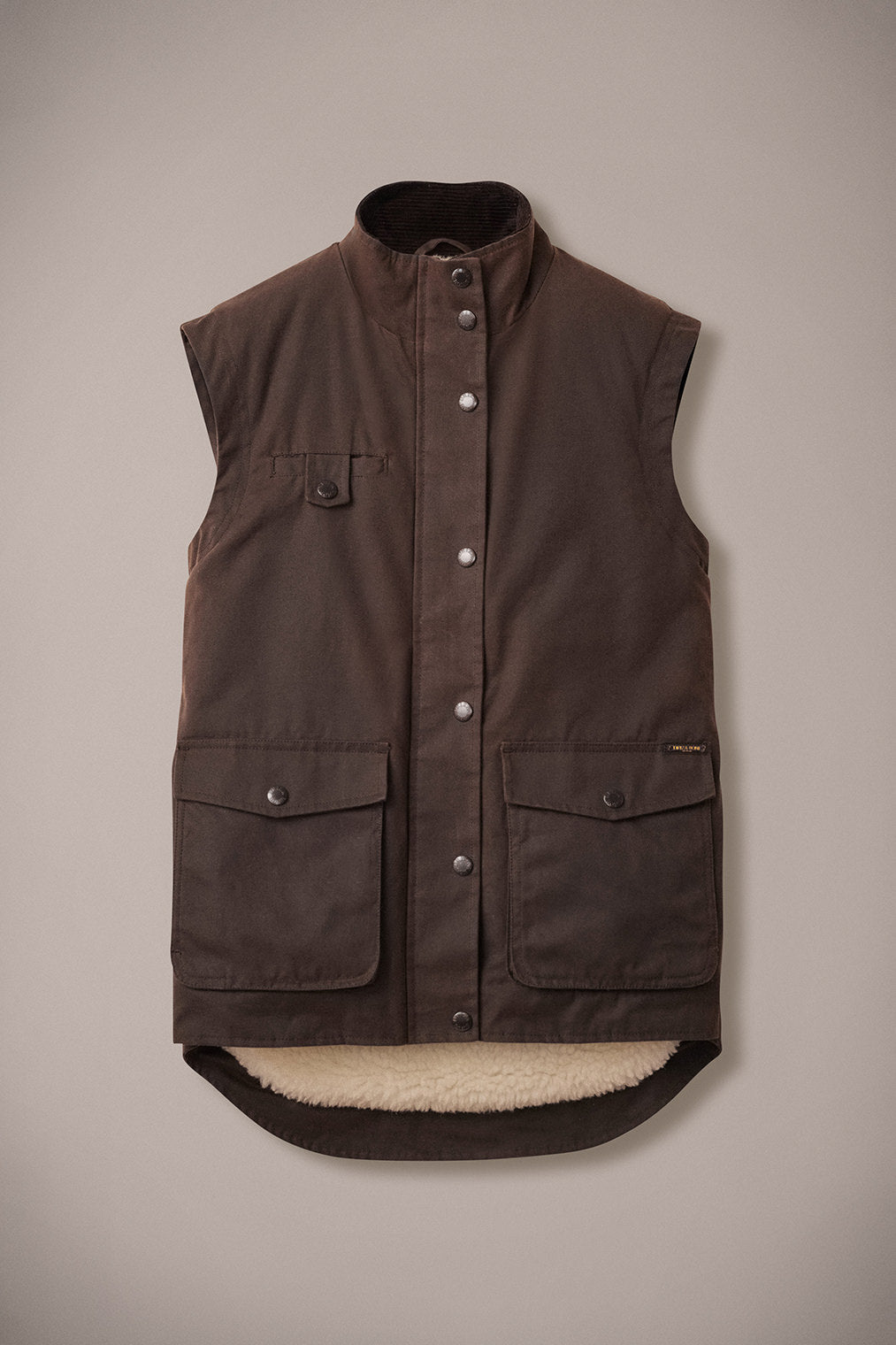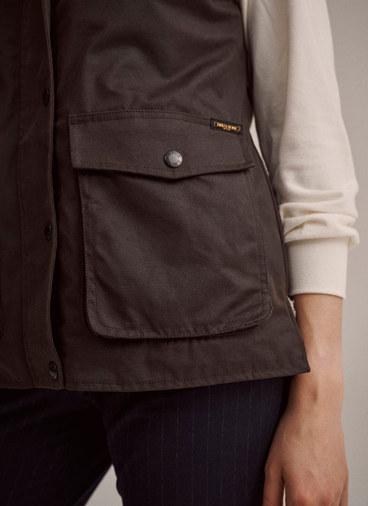 Crafted from our premium wind and water resistant heavy weight oilskin, the Women's Jumbuck Vest is lined with wool shearling and features a corduroy lined collar, zip front opening with studded flap closure, adjustable rear tabs for shape and movement, two way pockets with flaps and handwarmer side pockets and an internal pocket.