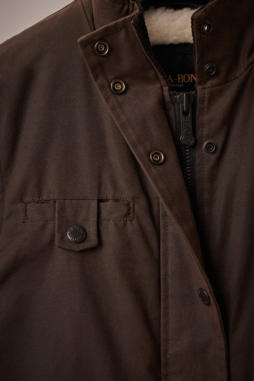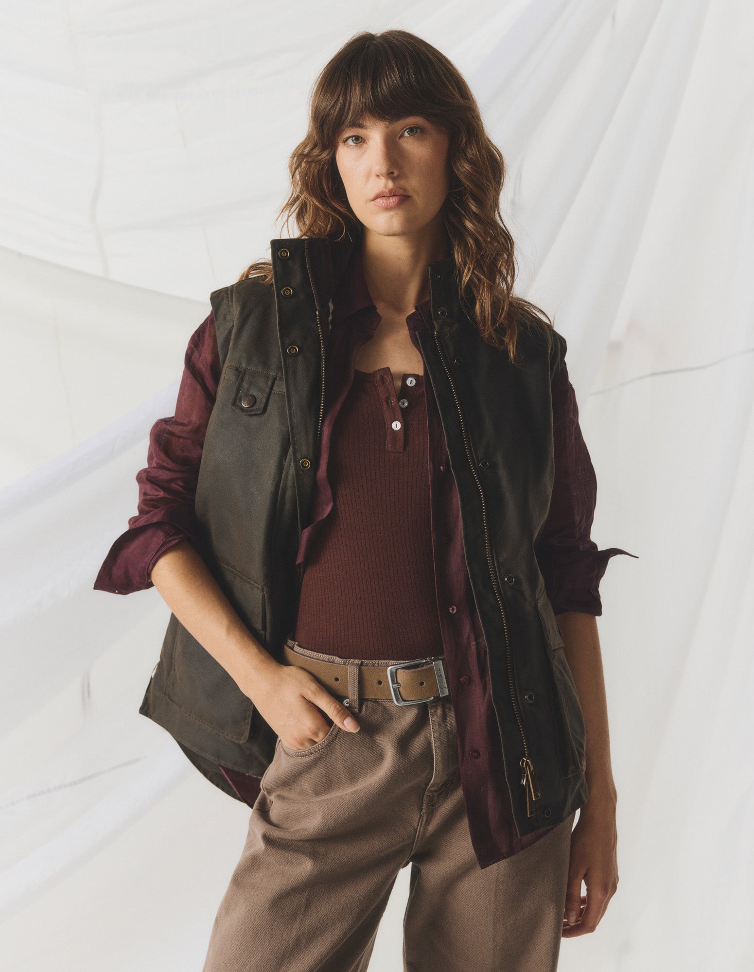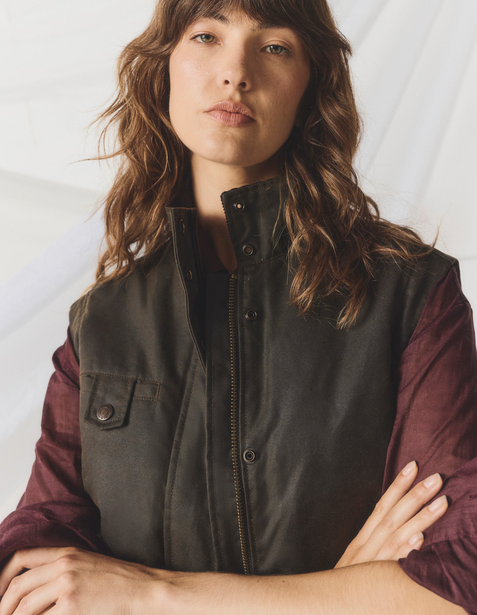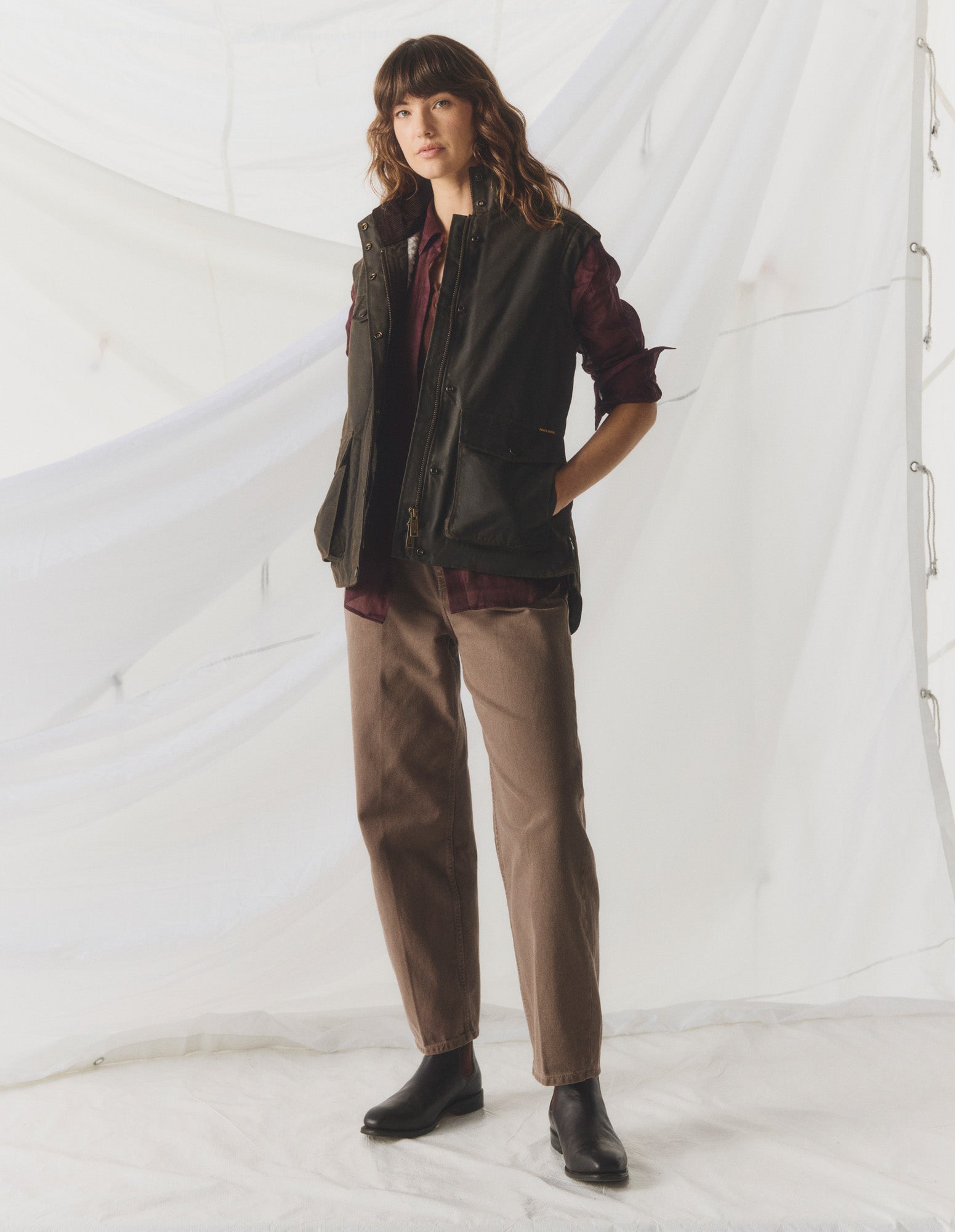 Crafted from our premium wind and water resistant heavy weight oilskin, the Women's Jumbuck Vest is lined with wool shearling and features a corduroy lined collar, zip front opening with studded flap closure, adjustable rear tabs for shape and movement, two way pockets with flaps and handwarmer side pockets and an internal pocket.