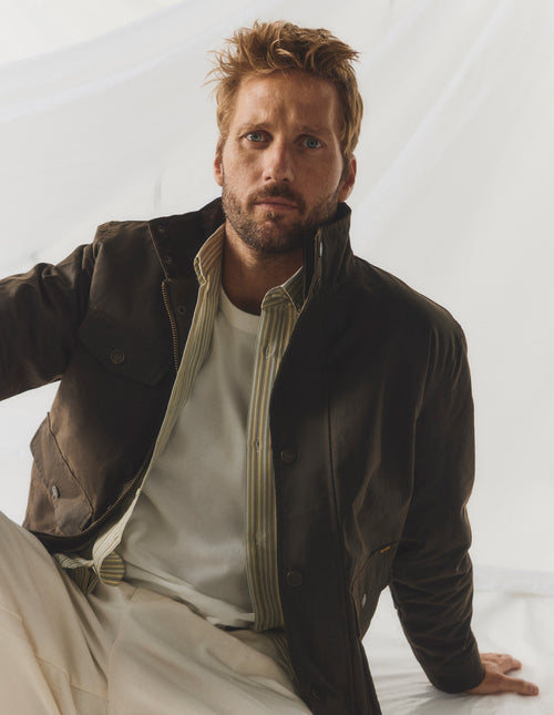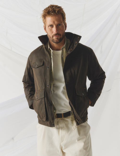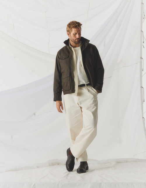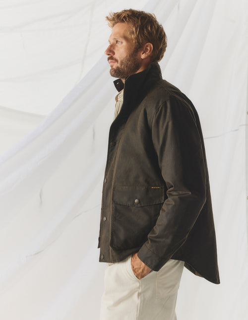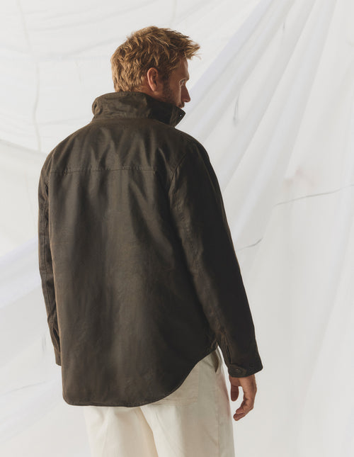 Lined with 100% wool shearling, the Lumberjack Jacket is made from our heavy weight wind and water resistant oilskin. Featuring a quilted lower body and sleeve for extra warmth, adjustable sleeve cuffs and a heavy duty two way zip with studded flap closure.