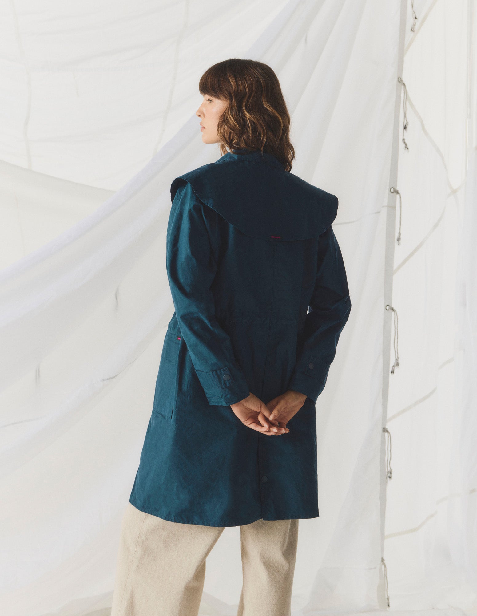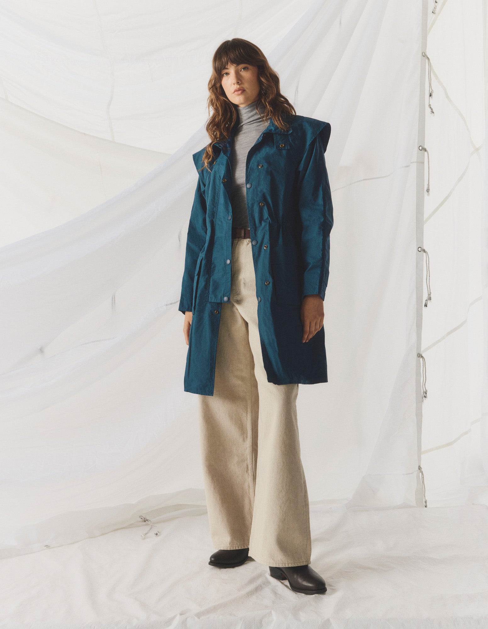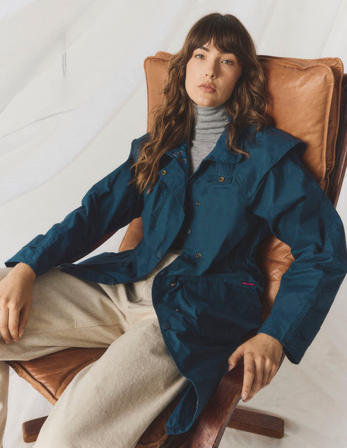 A stylish, year-round coat combining lightness, versatility, and weather resistance. Made from breathable waxed cotton shell and lined with a heritage map celebrating Australian pioneers. Features include a storm cape, concealed front placket, and signature buttons, reflecting generations of craftsmanship.